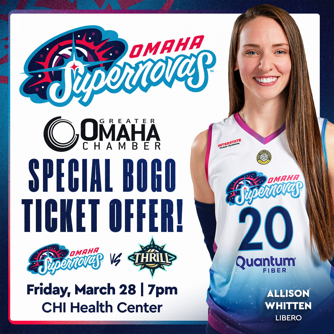 The Omaha Supernovas take on the Vegas Thrill at 7 p.m. CST on Friday, March 28, at CHI Health Center Omaha—and we’ve got exclusive offers just for Chamber members! Special Chamber Member Offer Enjoy discounted tickets as a thank-you for your impact on our local economy. Gather your team, network with fellow business leaders, and take in the premier in-venue experience in professional volleyball!